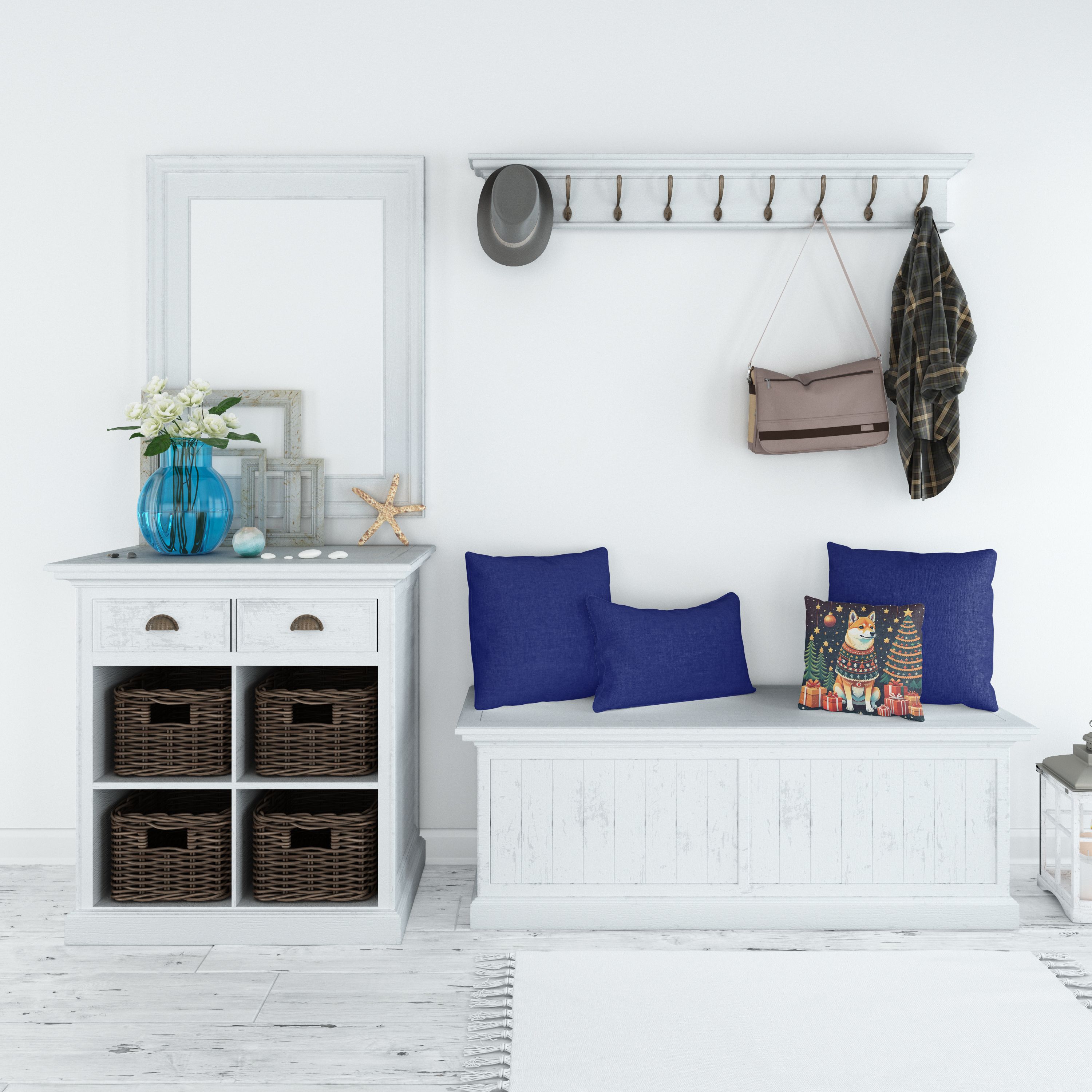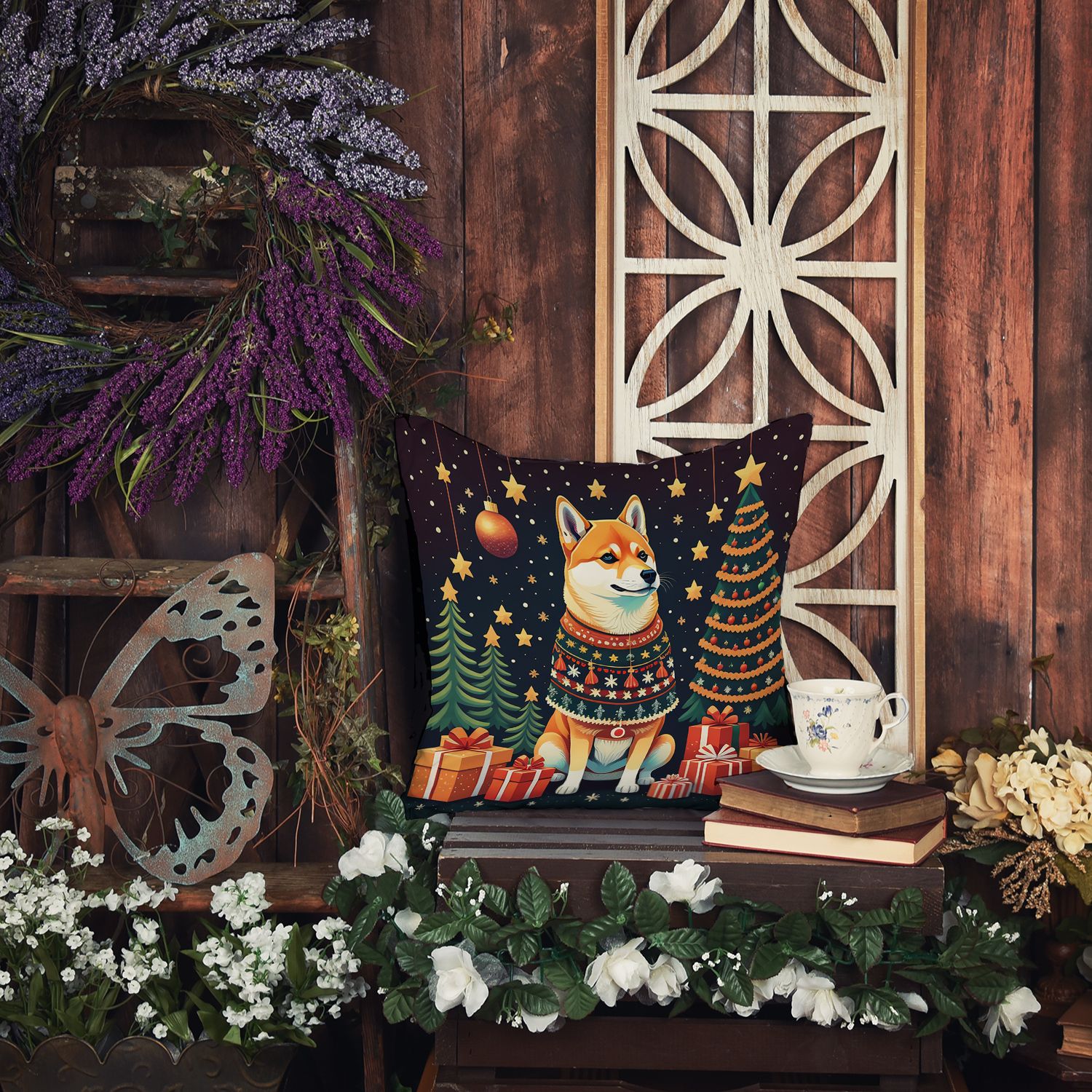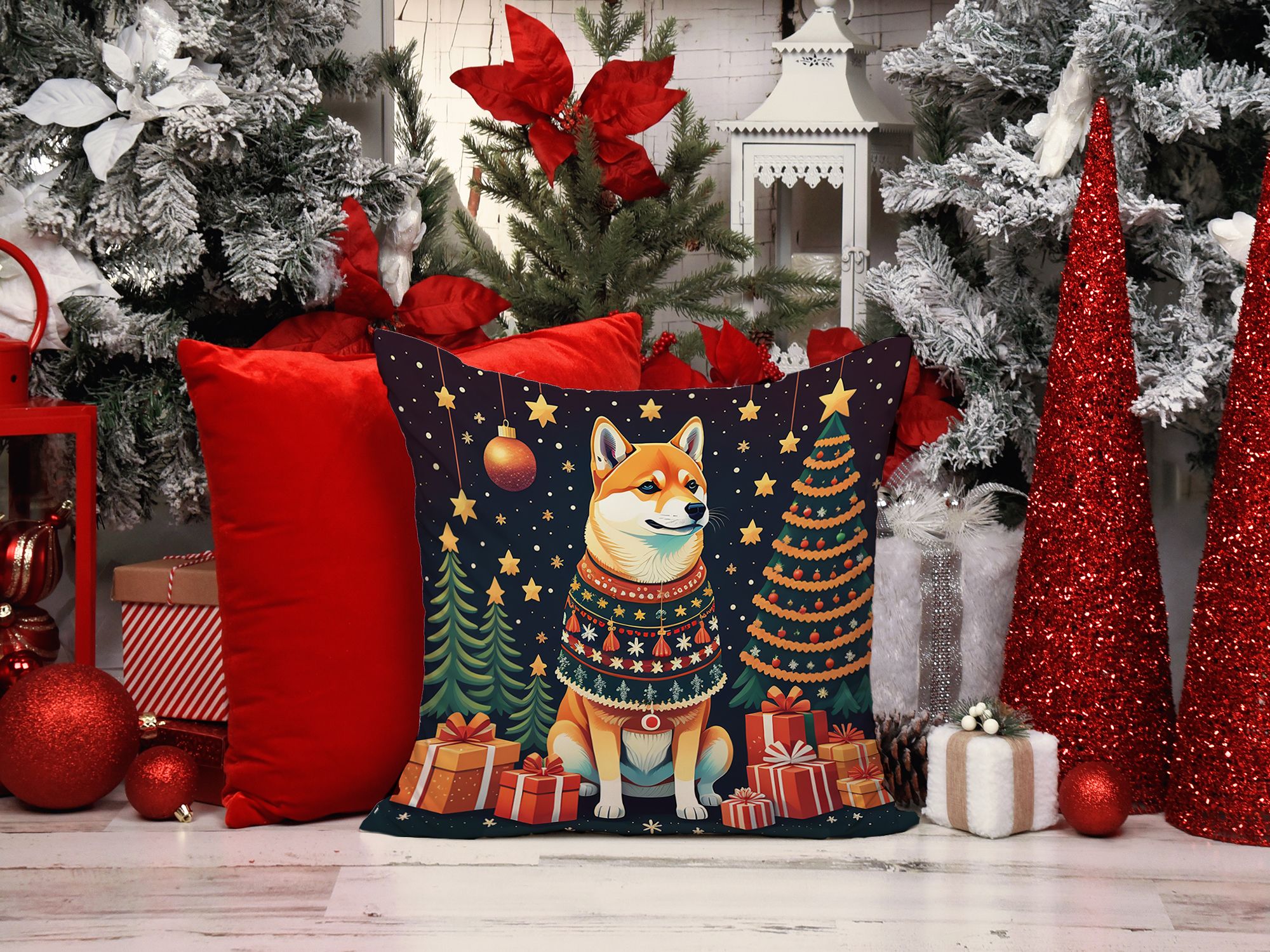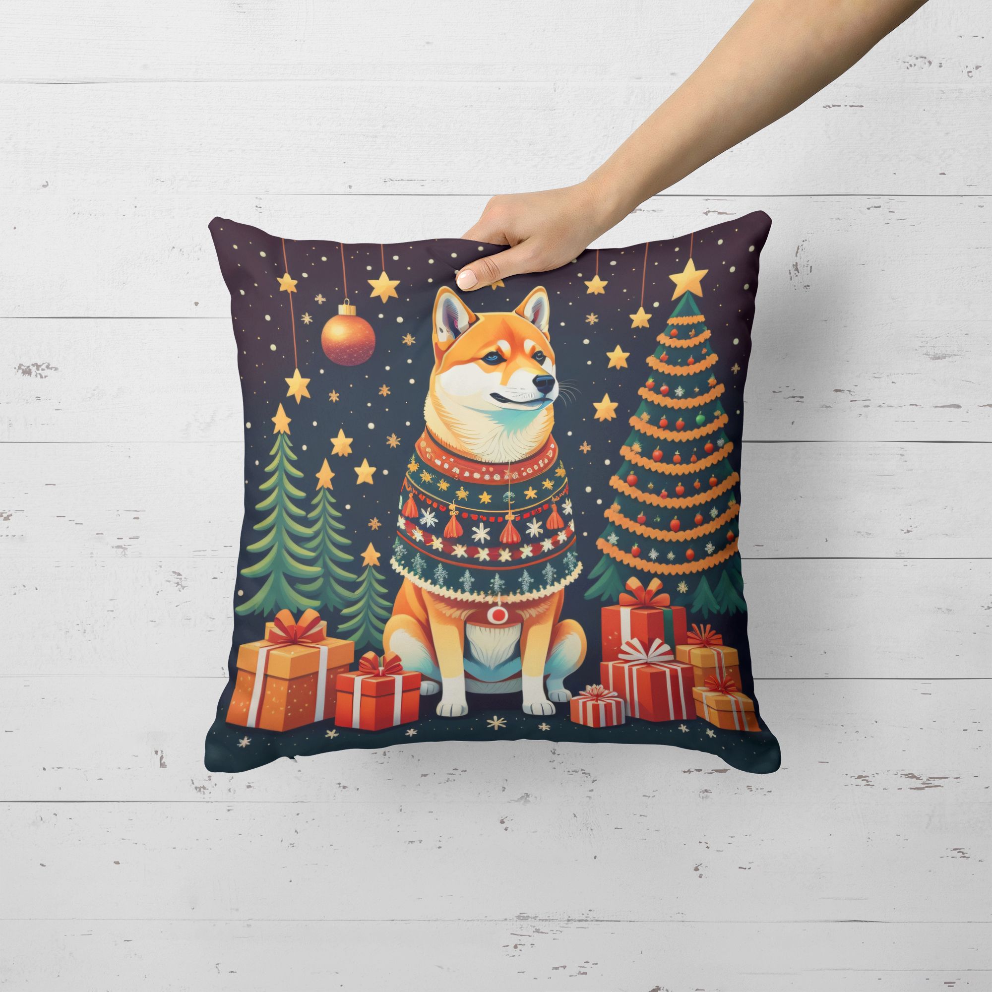 Throw Pillow featuring breed specific Shiba Inu artwork. Celebrate Christmas with this Christmas Pillow. Add a touch of vibrancy and comfort to your outdoor seating with Caroline's Treasures Fabric Decorative Pillow. Measuring approximately 14 inches by 14 inches, this outdoor pillow is crafted to elevate the appeal of your patio furniture, infusing it with vivid color and artistic flair. The pillow includes a 100% Polyester Fabric sham filled with a quality pillow form to provide superior comfort. Innovatively made from our brand new material, specifically woven for its water resistance, this pillow is designed for durability. The soft canvas fabric offers versatility in use, fit for your indoor couch or your outdoor patio, porch, or veranda. The fabric is dyed with colorfast dyes built for resilience against weather conditions, ensuring the pillow retains its beauty over time. Constructed by sewing three fabric pieces to create a sham, the polyester insert is then nestled inside to form the pillow, resulting in an overstuffed pillow that maintains its shape. Both the sham and the pillow insert are proudly made in the United States. As the pillows are handcrafted, there may be minor variations in size, further enhancing their unique charm. Experience comfort in style with Caroline's Treasures Fabric Decorative Pillow.