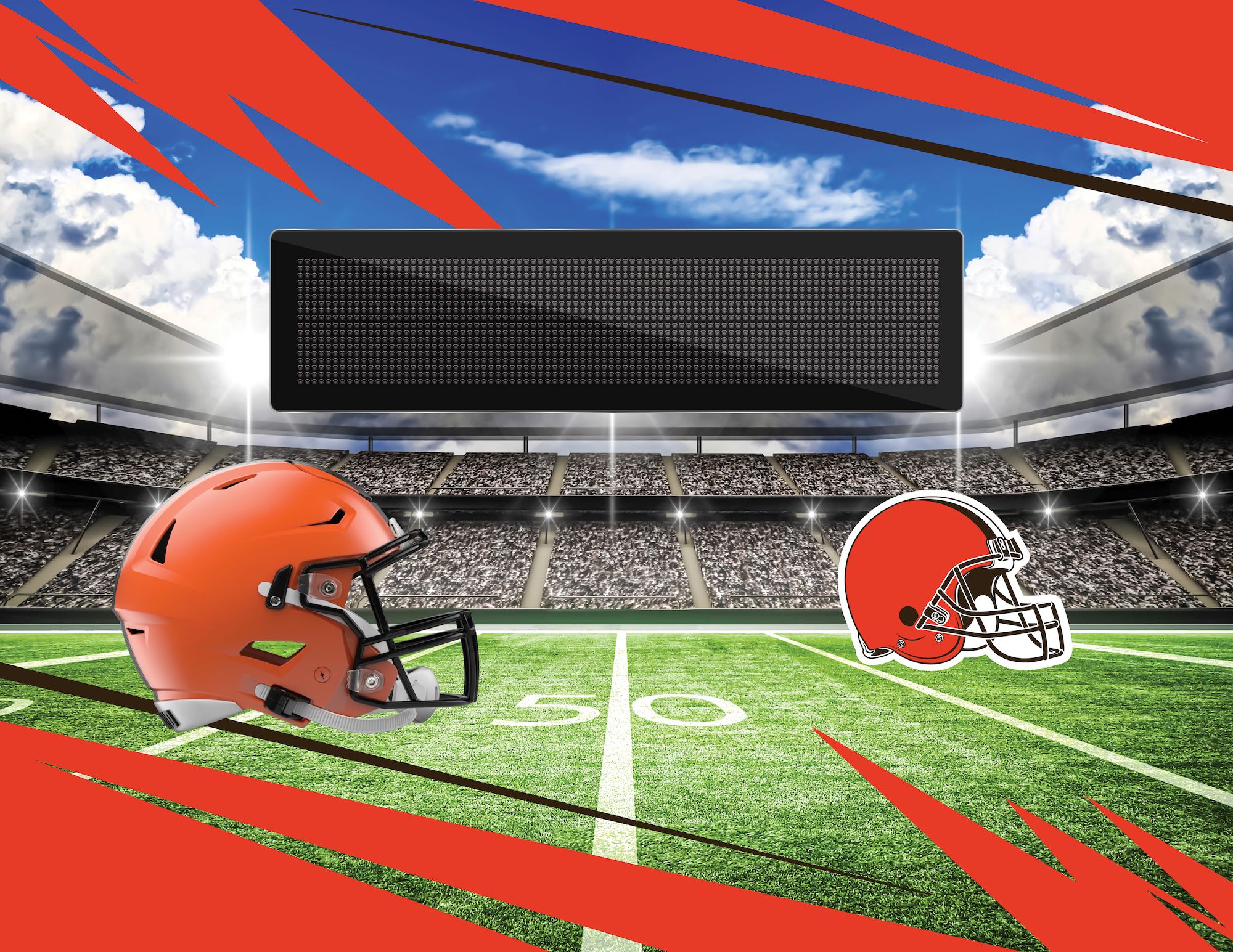 Features a football stadium, helmet and your favorite team's logo with a scoreboard ready for your personalization