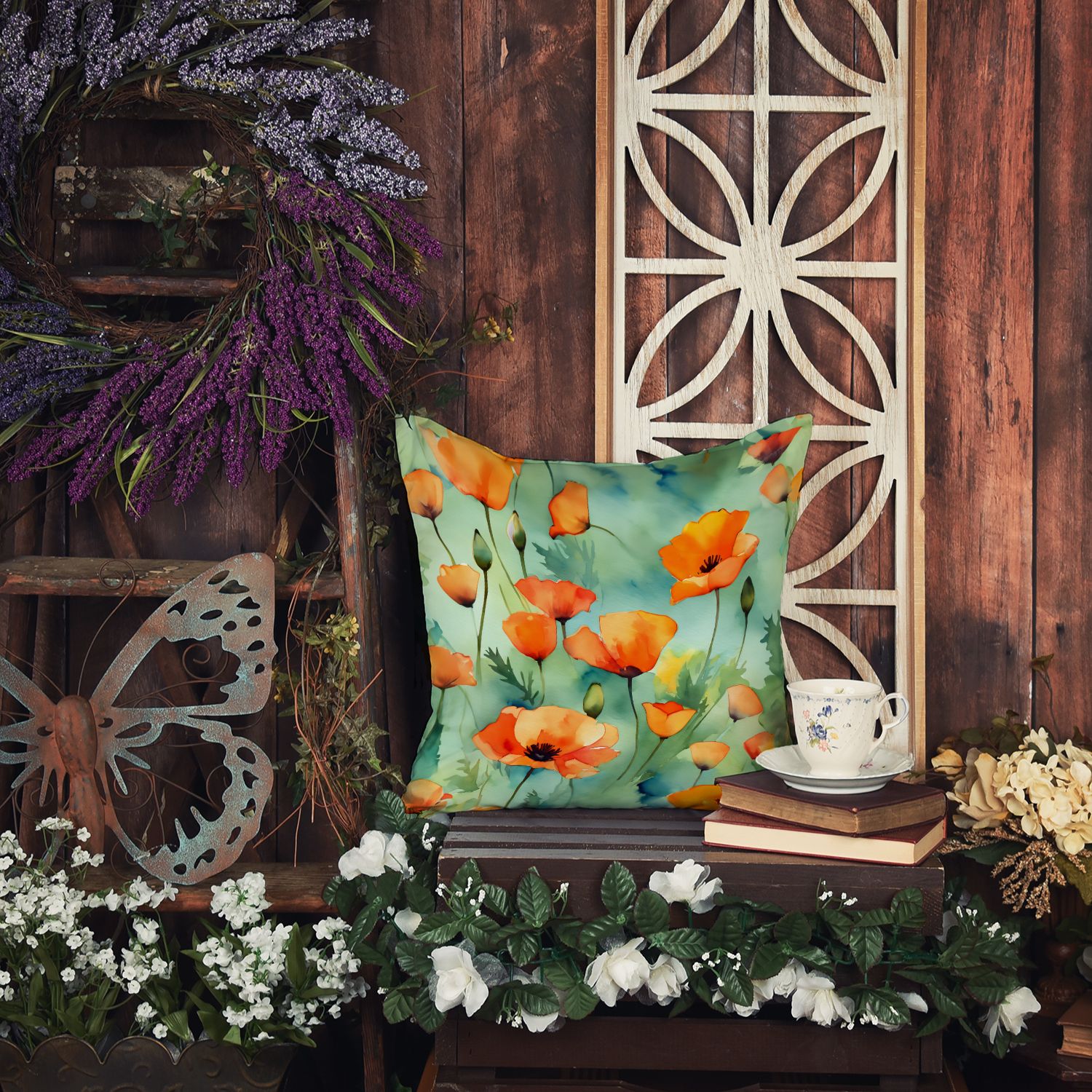 Throw Pillow featuring breed specific California California Poppies artwork. Revitalize your outdoor or indoor living space with Caroline's Treasures 18x18 Fabric Decorative Pillow. With a generously sized dimension of approximately 18 inches by 18 inches, this pillow makes a comfortable and aesthetic addition to any seating area. Made from a unique, water-resistant material developed by Caroline's Treasures, the pillow sham is 100% polyester fabric that's durable and ready to weather any condition. Its vibrant, full-color artwork will not fade over time as it is dyed with color-fast dyes. Whether you place it on your patio furniture, porch, veranda, or indoor couch, its soft canvas fabric ensures a cozy experience. The pillow is handcrafted in the United States, featuring a sham created from three pieces of fabric and a polyester insert for enduring shape and overstuffed comfort. Despite being robustly built to endure the outdoors, it is as soft and snug as your favorite indoor cushions. Please note, as all our pillows are handmade, sizes may vary slightly, adding to the charm of this unique decorative item.