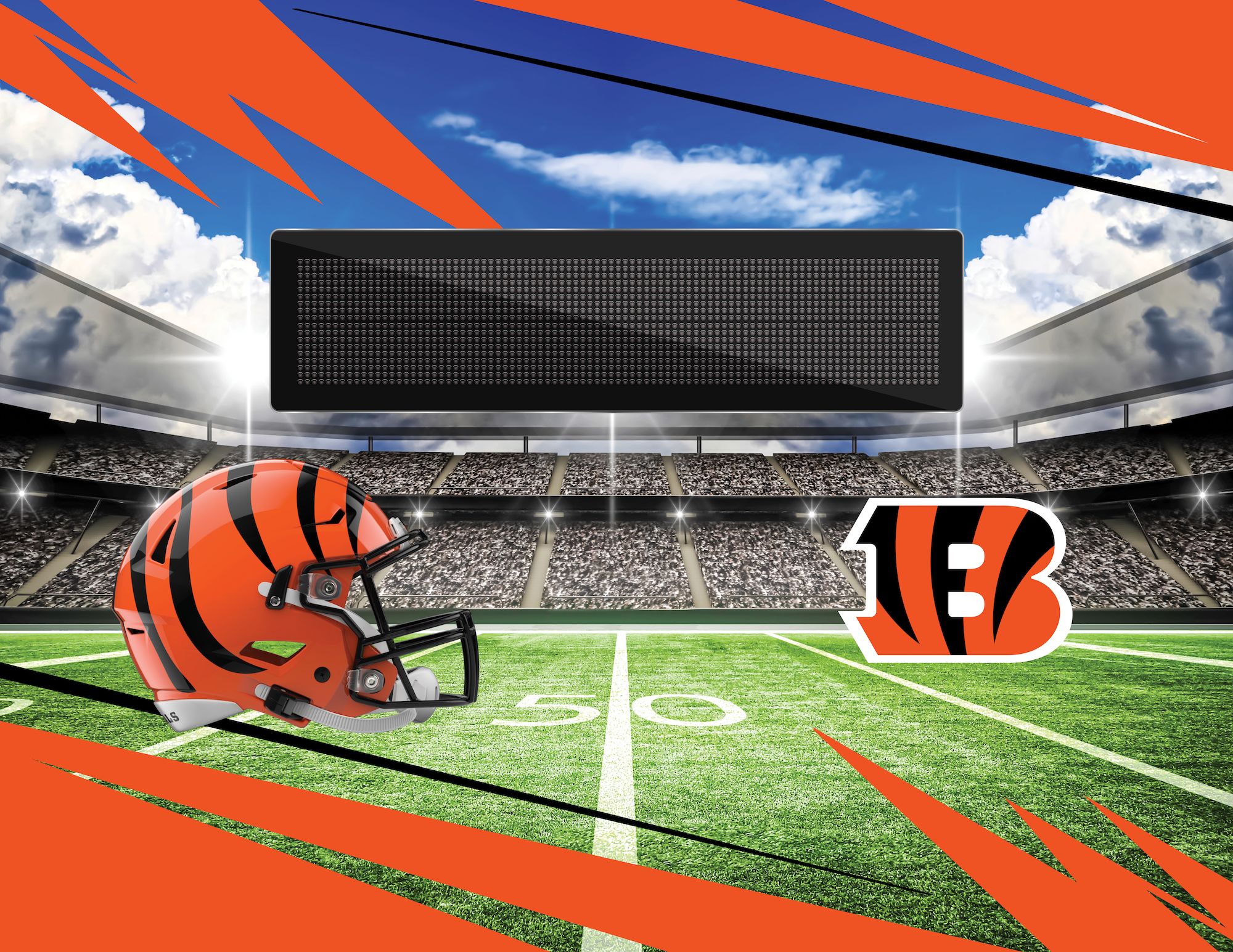 Features a football stadium, helmet and your favorite team's logo with a scoreboard ready for your personalization