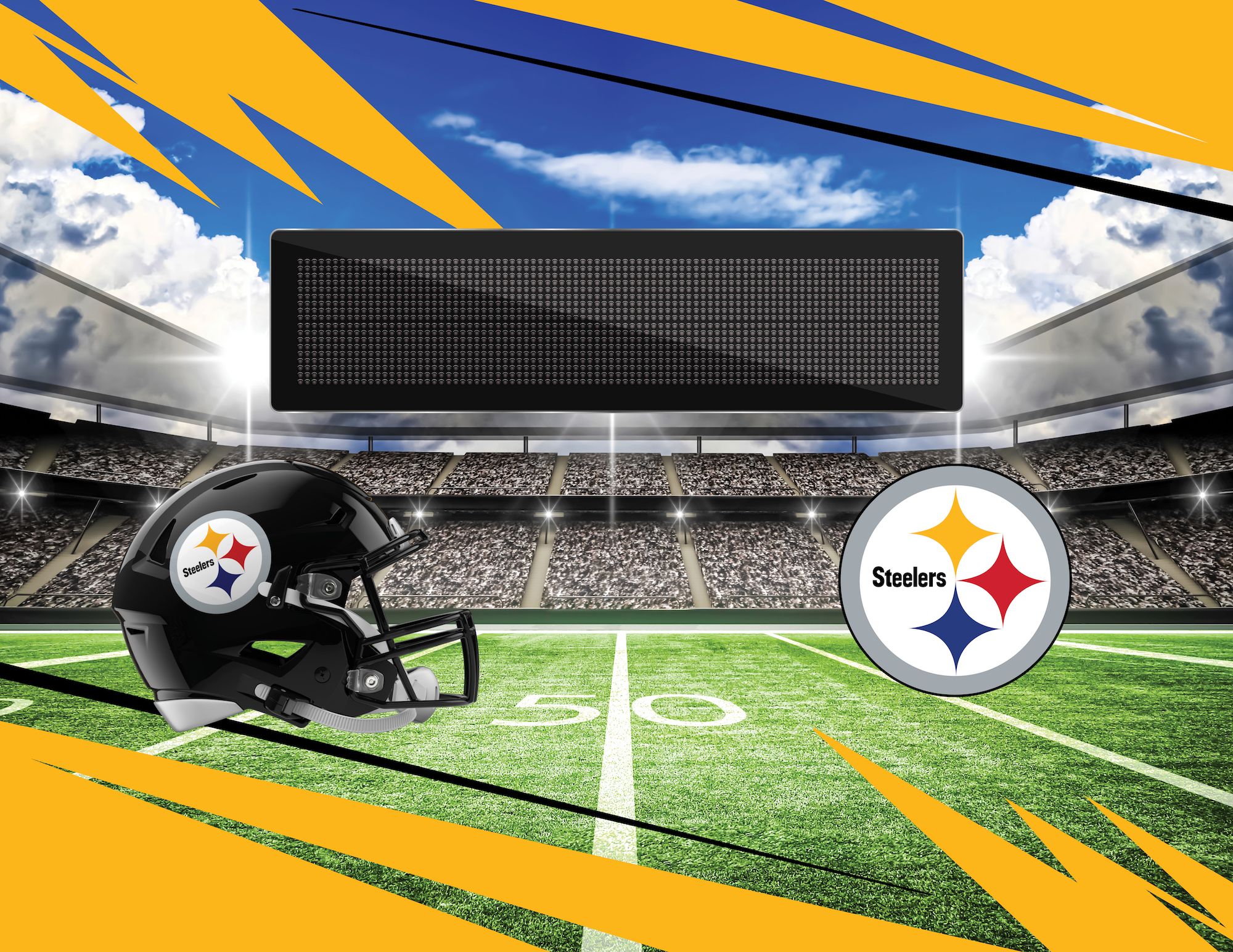 Features a football stadium, helmet and your favorite team's logo with a scoreboard ready for your personalization
