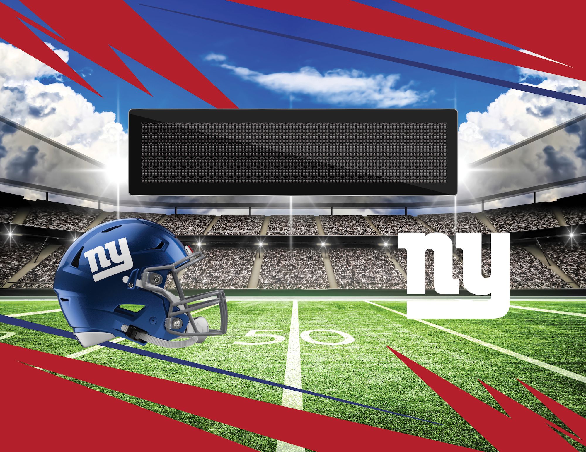 Features a football stadium, helmet and your favorite team's logo with a scoreboard ready for your personalization