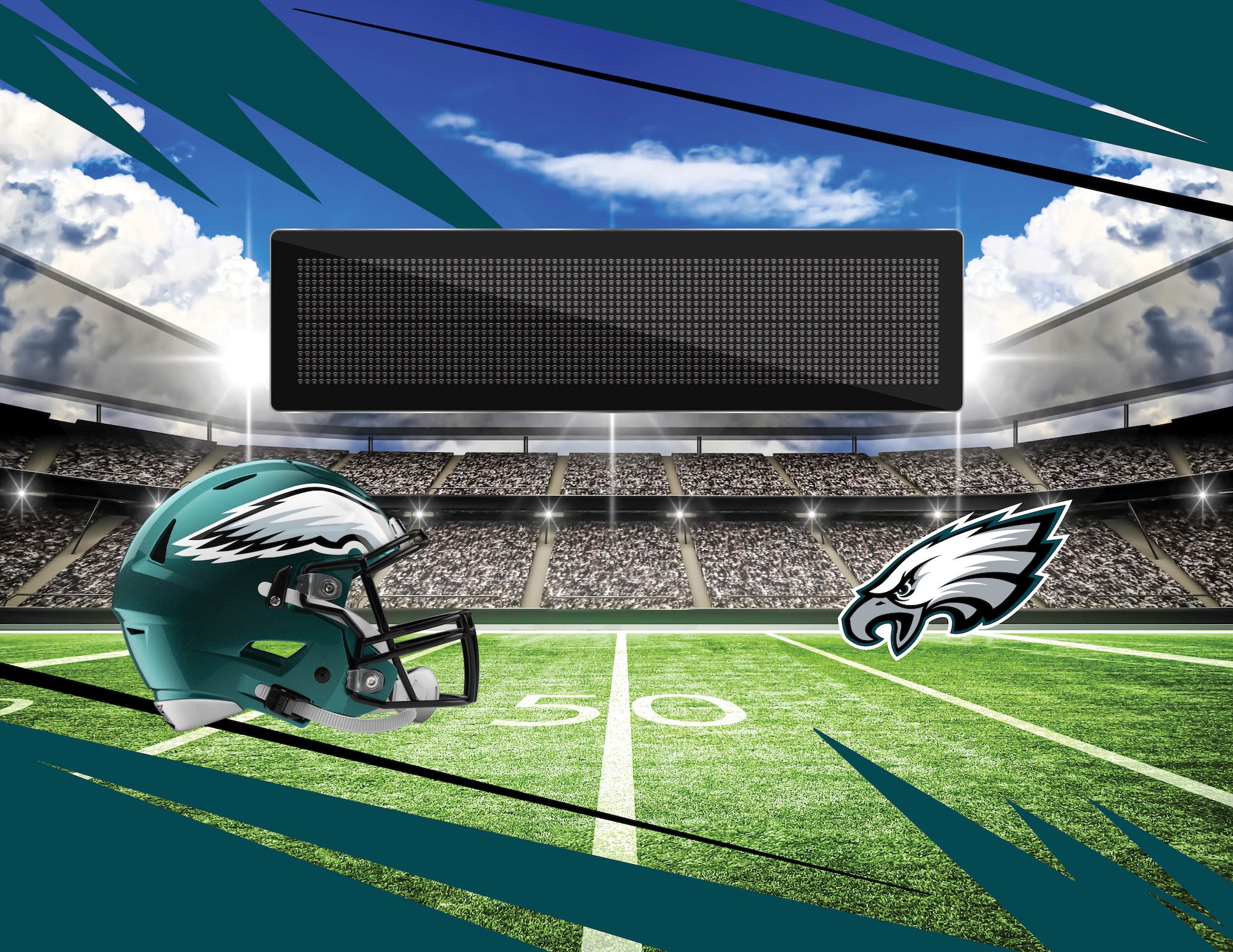 Features a football stadium, helmet and your favorite team's logo with a scoreboard ready for your personalization