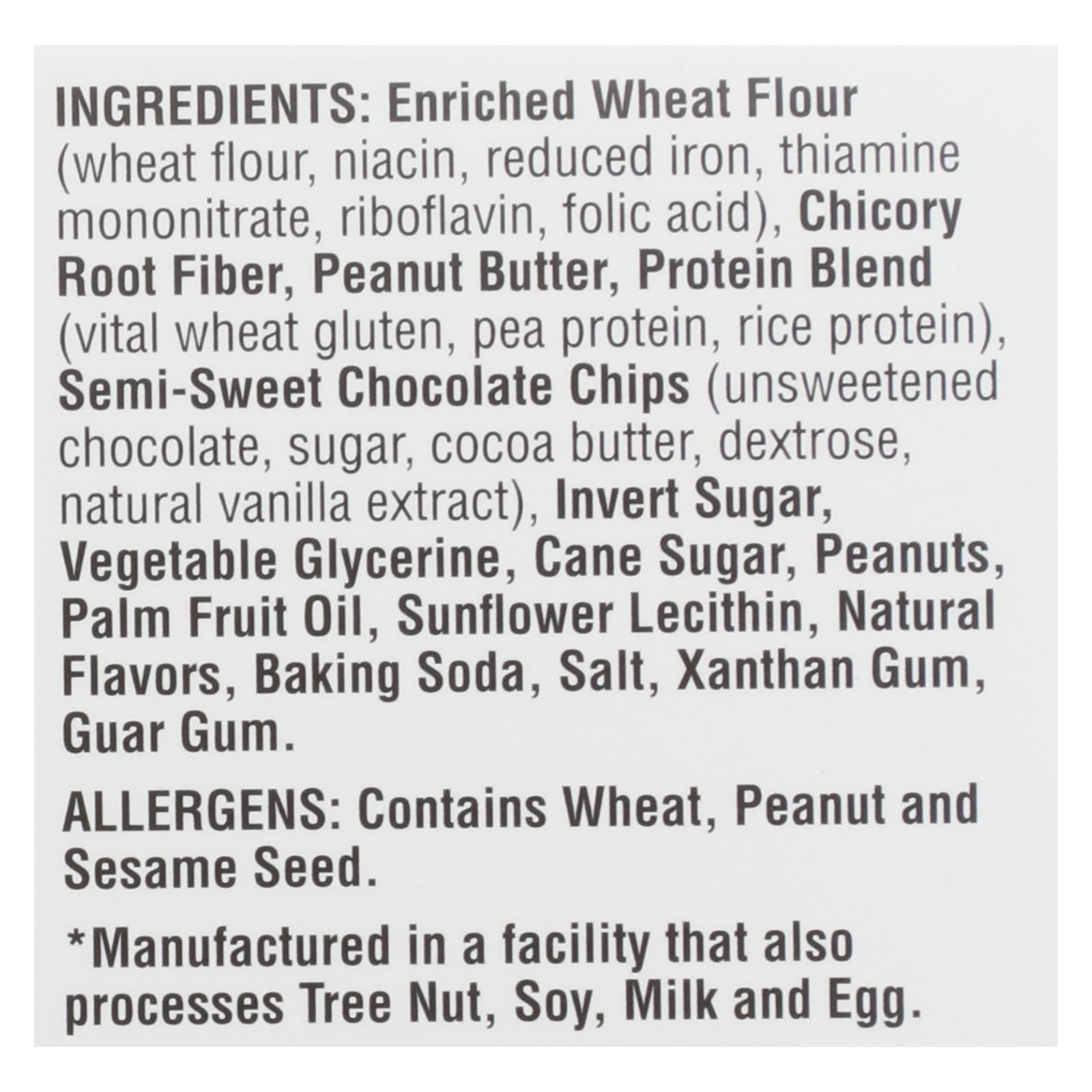 ingredients : enriched wheat flour;wheat flour;niacin;reduced iron;thiamine mononitrate;riboflavin;folic acid;chicory root fiber;peanut butter;protein blend;vital wheat gluten;pea protein;rice protein;semi-sweet chocolate chips;unsweetened chocolate;sugar;cocoa butter;dextrose;natural vanilla extract;invert sugar;vegetable glycerine;cane sugar;peanuts;palm fruit oil;sunflower lecithin;natural flavors;baking soda;salt;xanthan gum;guar gum