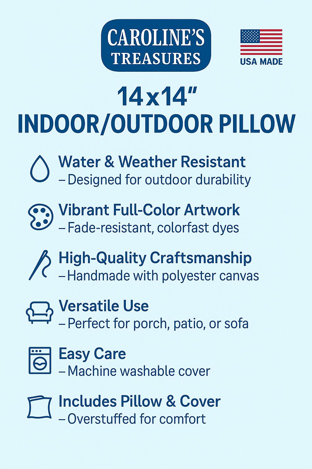 2.Durable & Water-Resistant: Crafted from Caroline's Treasures' new material designed to resist water, this pillow is perfect for outdoor use. The colorfast dyes ensure the design remains vibrant, weathering all conditions.