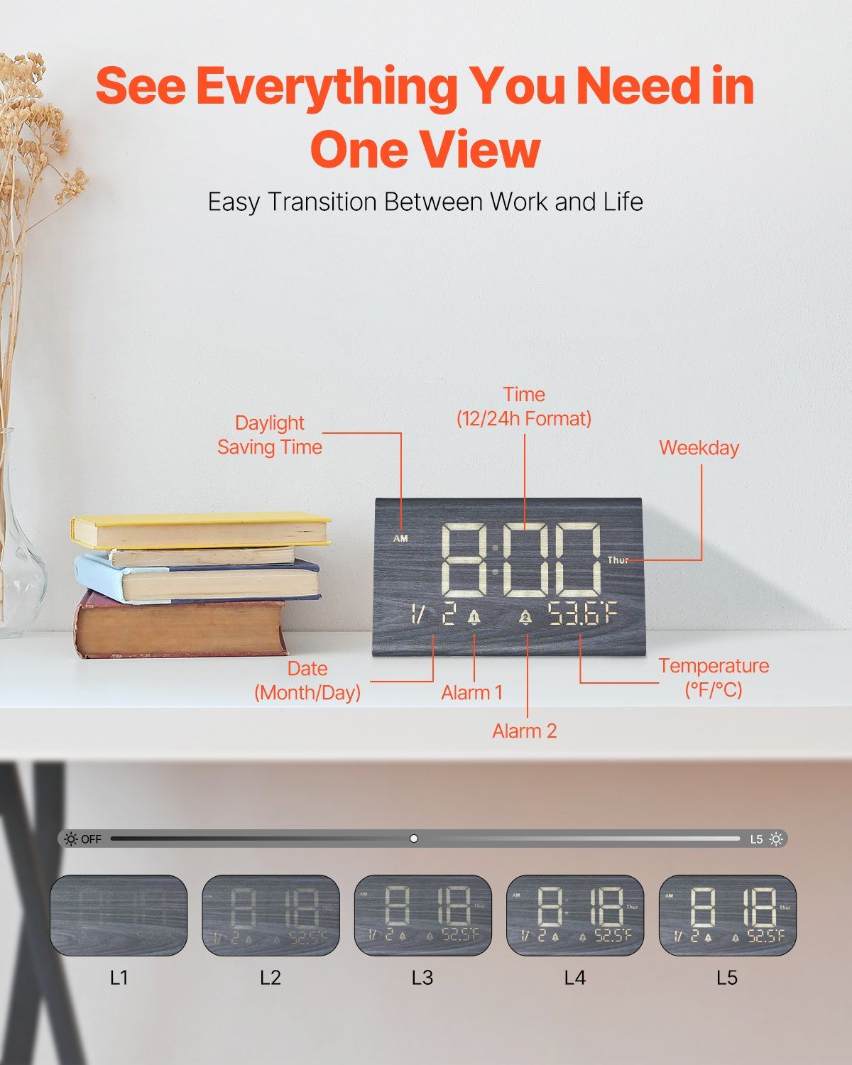 2.Clear & Multi-Function Display: This alarm clock shows everything you need at a glance-time (12/24-hour), date, day of the week, indoor temperature (°F/°C), and daylight saving time settings. The screen has 5 brightness levels, so you get a clear, easy-to-read display, whether it's day or night.