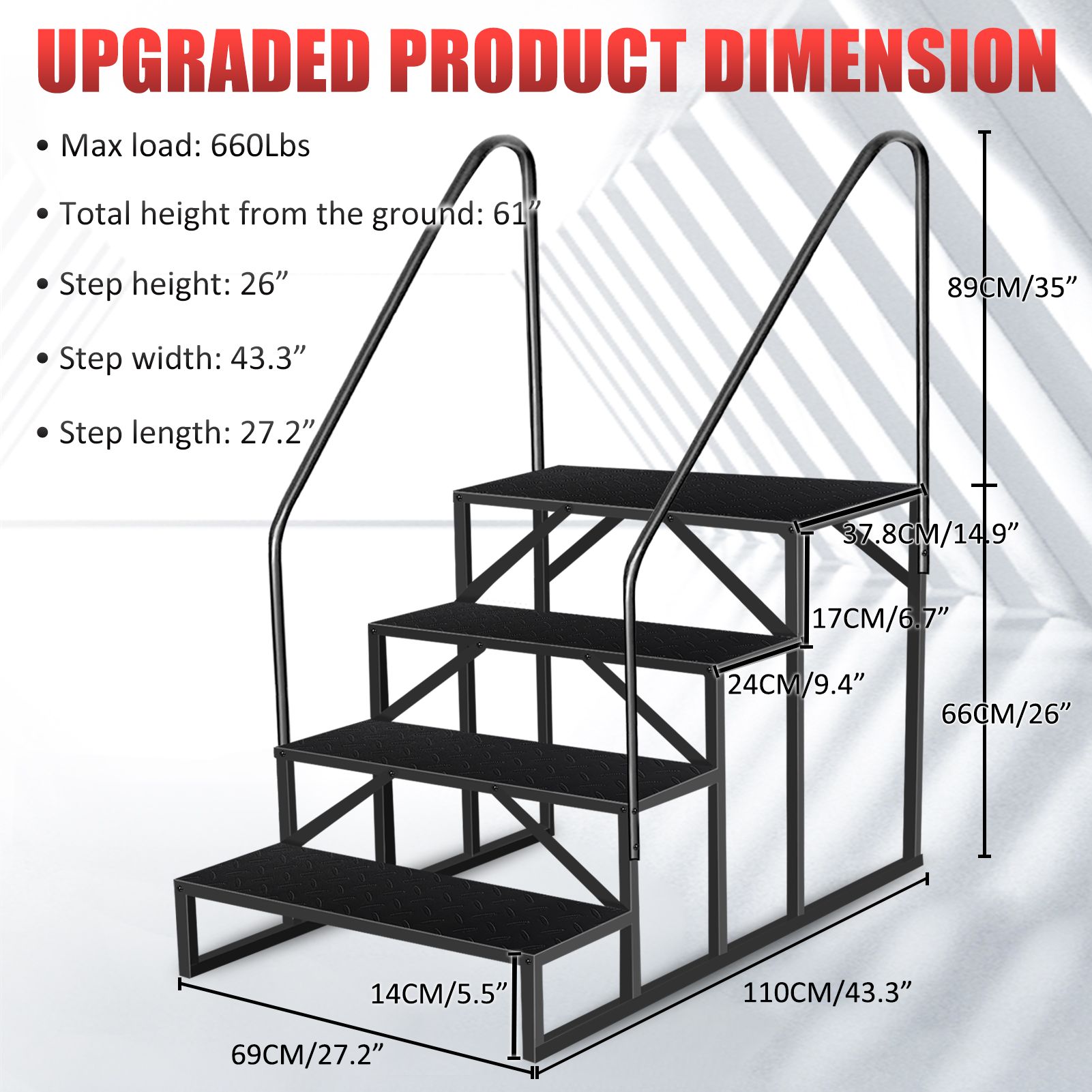 2.Multifunctional Steps for Outside: Our mobile home stairs are convenient car door steps that can be attached to the threshold of an RV, campervan, or travel trailer, making it easier to get in and out of the vehicle. It is also a portable spa step that can be used for hot tubs, and ground swimming spas